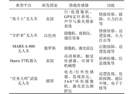 ÒÔÉ«ÁС¢¶íÂÞ˹¡¢Ó¢¹úºÍµÂ¹úÒ²Ïà¼Ì¾ÙÐÐÁ˽µØÎÞÈËϵͳµÄÑÐÖÆÊÂÇ飬²¢Ñз¢³öÁËһϵÁÐÏȽøµÄ²úÆ·£¬²úÆ·ÁбíÈç±í1Ëùʾ¡£ÀýÈ磬ÒÔÉ«ÁÐÑз¢µÄ“ÊØ»¤ÕߔϵÁÐ×ÔÖ÷ÎÞÈ˳µ¿ÉÒÔÍŽá´îÔØµÄ´«¸ÐÆ÷ÓëÈÚºÏËã·¨£¬×ÔÖ÷Õì̽Óëʶ±ðΣÏÕÕϰ­£¬Ö´ÐÐѲÂß¡¢¼àÊÓÓëС¹æÄ£µÄ»ðÁ¦¹¥»÷ʹÃü£»¶íÂÞ˹ÑÐÖÆµÄMARSA-800ÎÞÈ˳µ¿ÉÒÔÖ´ÐÐÔËÊäºÍºóÇÚ°ü¹ÜÒÔ¼°¸ú×Ù¼àÊÓµÈʹÃü£¬²¢¿ÉÒÔÔÚÖ´ÐÐʹÃüµÄÀú³ÌÖÐʵÏÖ×ÔÖ÷·¾¶ÍýÏ룬¹æ±ÜÕϰ­£¬¸ÃÎÞÈ˳µÒÑÔÚÐðÀûÑÇÕ½³¡¾ÙÐа²ÅÅ¡£Ó¢¹úºÍµÂ¹ú¶Ô½µØÎÞÈËϵͳµÄÑо¿Ò²¿ªÕ¹µÃ½ÏÔ磬Ӣ¹úÓÚÉÏÊÀ¼Í60ÄêÔ¾ÍÍÆ³öÁËÊÖÍÆ³µÅű¬»úеÈË£¬ØÊºóÓÖÍÆ³öHarrisT7´¥¾õ·´Ïì»úеÈË£¬ÓÃÓÚÖ´Ðв𵯡¢Åű¬µÈΣÏÕʹÃü£»µÂ¹úÀ³Òð½ðÊô¹«Ë¾¿ª·¢µÄ“ʹÃü¾Þ½³”µØÃæÎä×°Õì̽ÎÞÈ˳µÖ÷ÒªÓÃÓÚÖ´ÐÐÕ½Êõ¼àÊÓ¡¢Î£ÏÕÎï¼ì²â¡¢Ò½ÁƺóËÍ¡¢Í¨Ñ¶ÖмÌÒÔ¼°»ðÁ¦Ö§Ô®Ê¹Ãü¡£