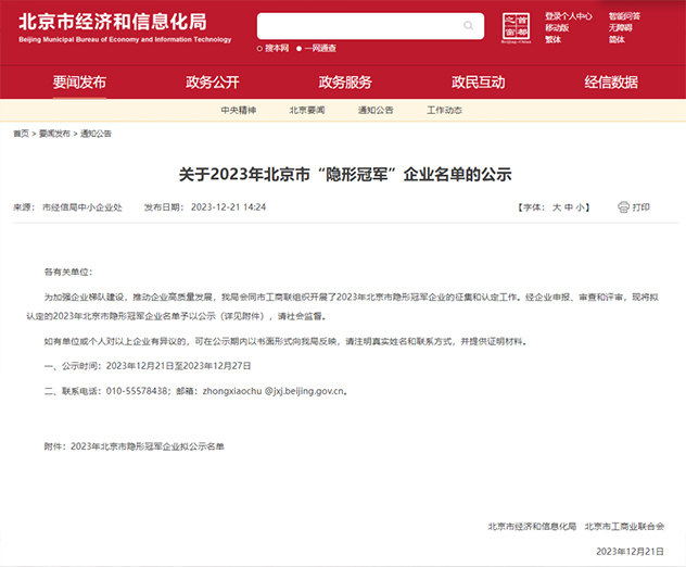 北京市“隐形冠军”企业认定由北京市经济和信息化局、北京市工商业团结会配合开展,旨在增进北京市经济高质量生长,支持企业做优做强,提升企业综合实力,加速形成企业梯队作育名堂。此次评选对参评企业的工业突破、科技研发水平、市园职位及财务质量等都提出了较高要求。